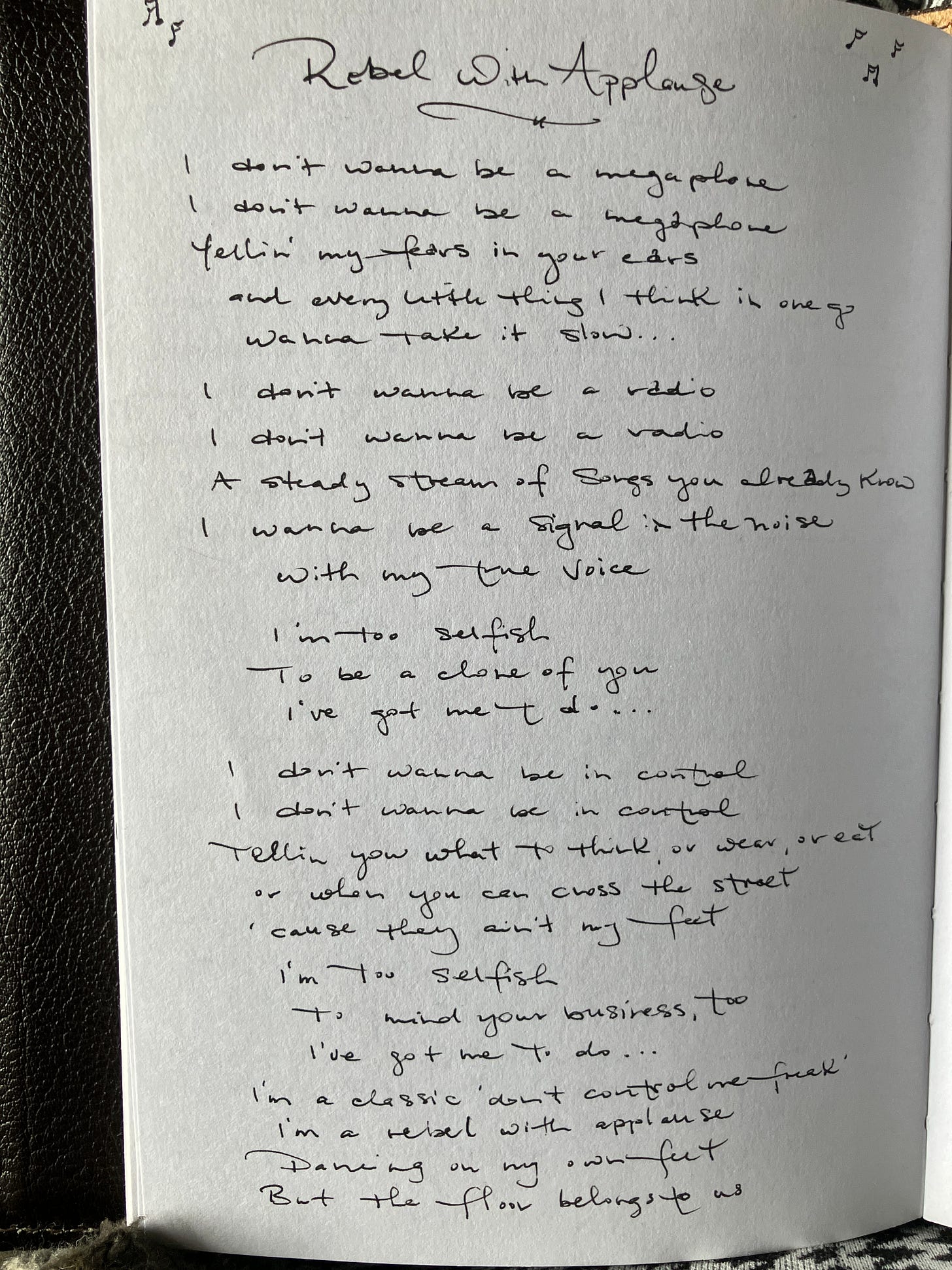 I wrote this song this past summer based upon thinking the thought “I’m not a control-freak, but a ‘don’t you dare control me freak’. The rest is, well, the rest is a couple verses and a kick-ass chorus.